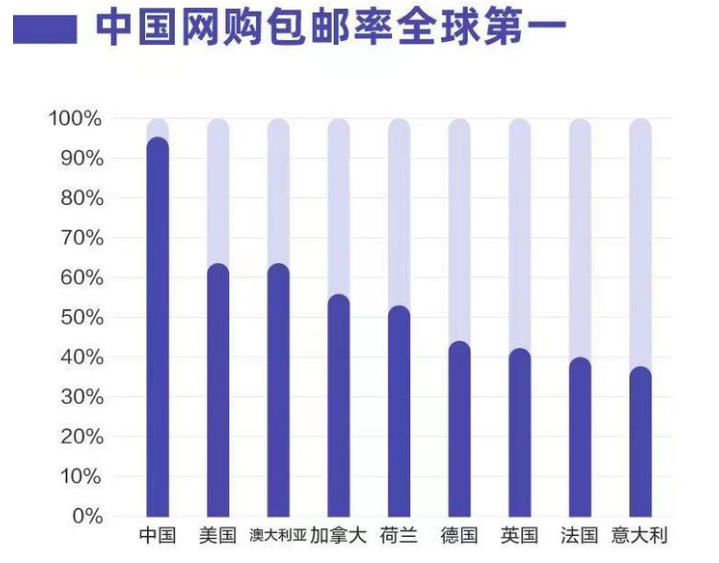 目前,我國(guó)的網(wǎng)購(gòu)包郵率已成為全球第一,通過(guò)亞馬遜的prime會(huì)員的滲透率推測(cè),排名第二的美國(guó)包郵率只在60%左右,中國(guó)遠(yuǎn)超其他歐美國(guó)家。包郵地區(qū),已從“江浙滬”悄然蔓延到了全國(guó)各地。