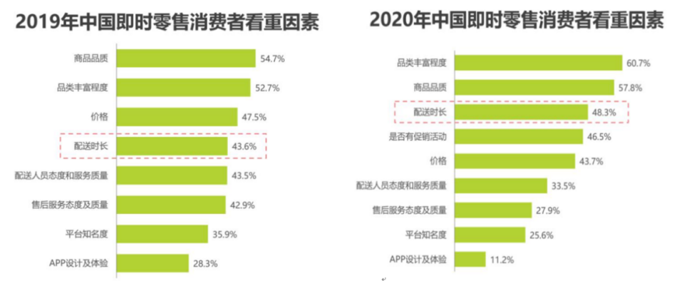 即時(shí)零售下,2019年至2020年,中國(guó)即時(shí)零售消費(fèi)者滿意因素發(fā)生了不小的變化:對(duì)品類豐富程度的關(guān)注從52.7%上升到60.7%,對(duì)配送時(shí)長(zhǎng)的關(guān)注從43.6%到48.3%,同時(shí)新增了促銷活動(dòng)這一關(guān)注點(diǎn)。無(wú)獨(dú)有偶,從近期一些調(diào)查顯示,50%的95后消費(fèi)者希望當(dāng)天就能收貨,有7%的用戶希望2小時(shí)內(nèi)可以拿到購(gòu)買的商品,并愿意為更快的配送服務(wù)支付合理金錢(qián)。