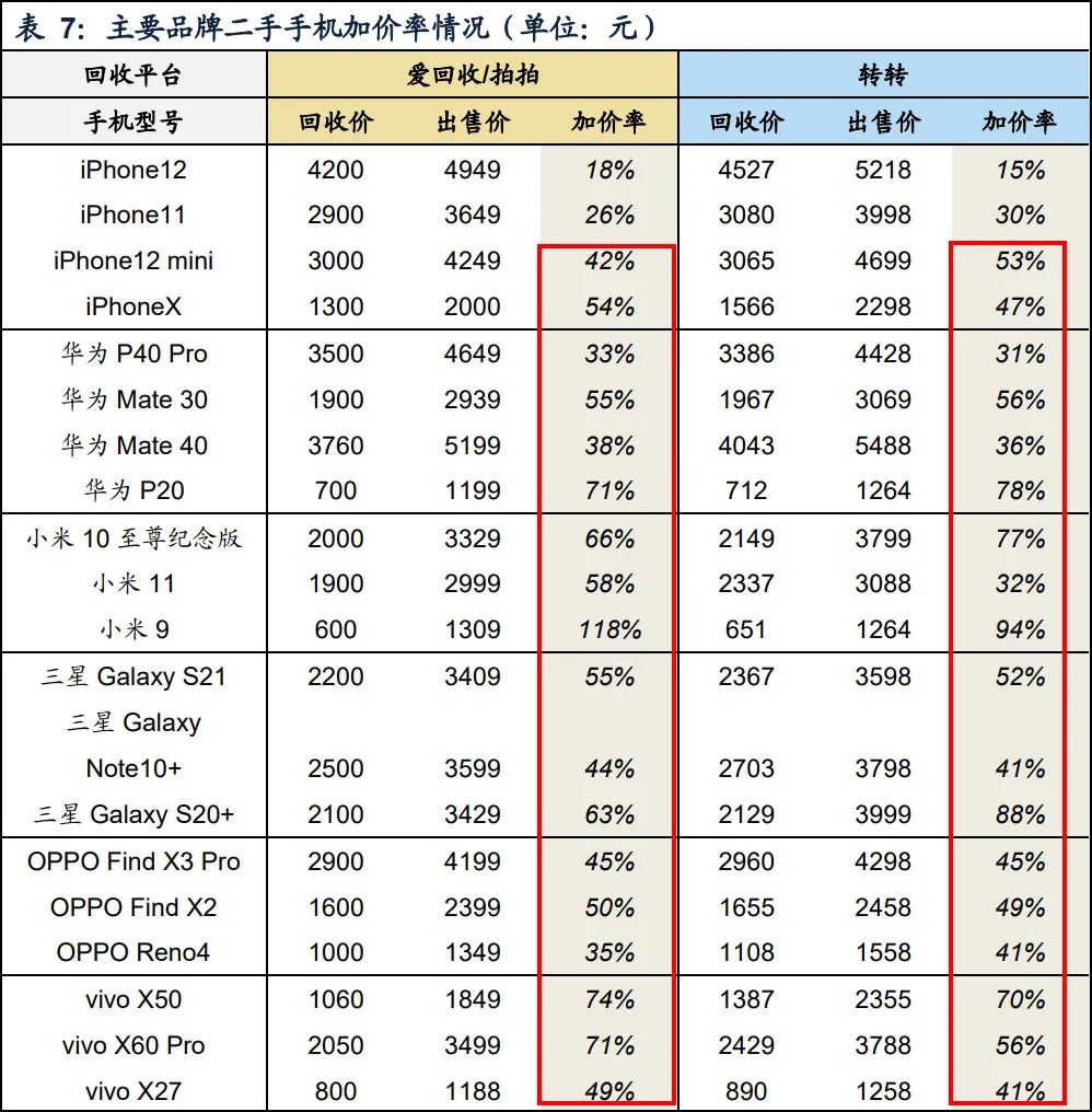愛回收/拍拍的加價(jià)率中位數(shù)為52%,刨掉近兩代iPhone后為55%。轉(zhuǎn)轉(zhuǎn)的加價(jià)率中位數(shù)為48%,刨掉近兩代iPhone后為51%。