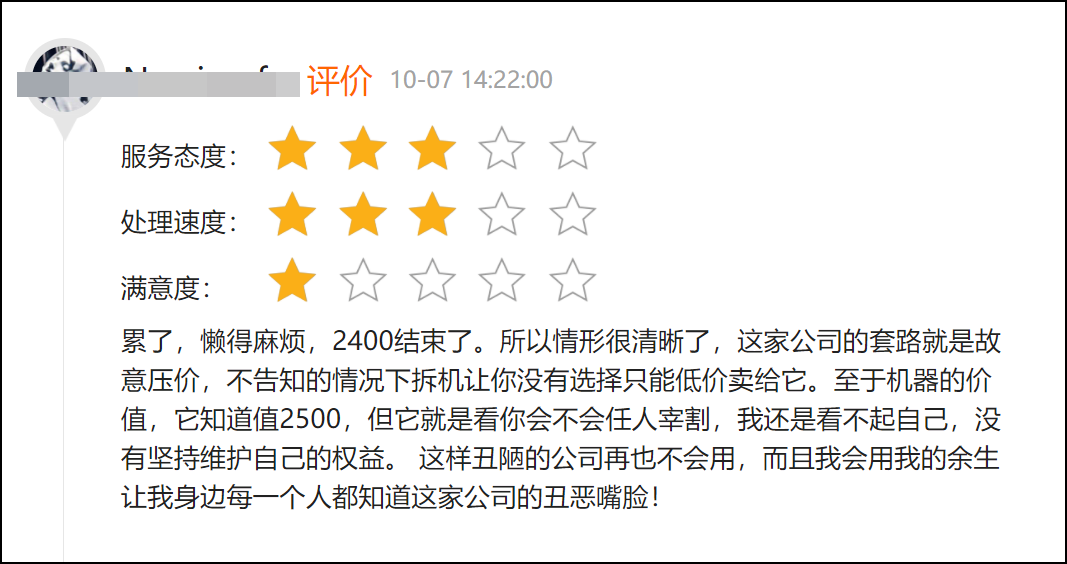 從古至今,雙贏是最好的商業(yè)策略,通過與個(gè)人賣家博弈來降低成本是很傷口碑。你去黑貓投訴上搜索“愛回收”,整個(gè)十月份能看到很多關(guān)于壓價(jià)的投訴。