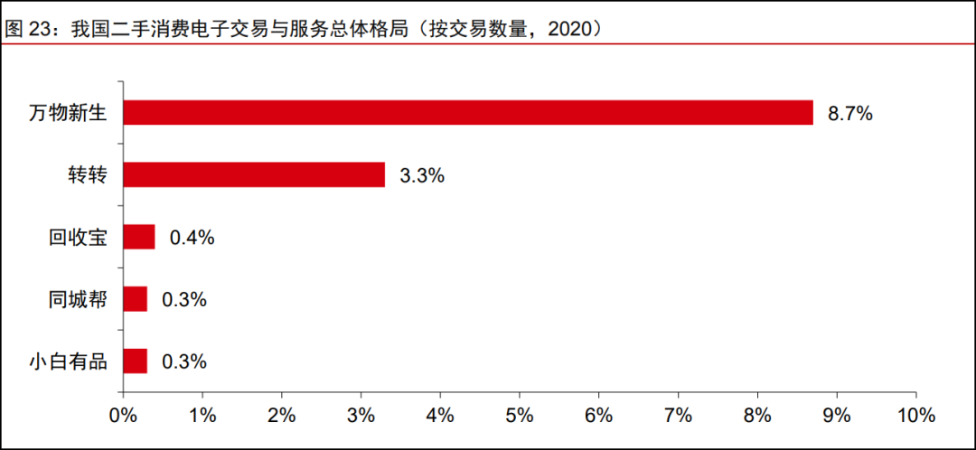 萬物新生登陸二級市場,給人以絕對龍頭的感覺。8.7%的市占率大幅領(lǐng)先,大于其它四家公司(轉(zhuǎn)轉(zhuǎn)、回收寶、同城幫、小白有品)之和。