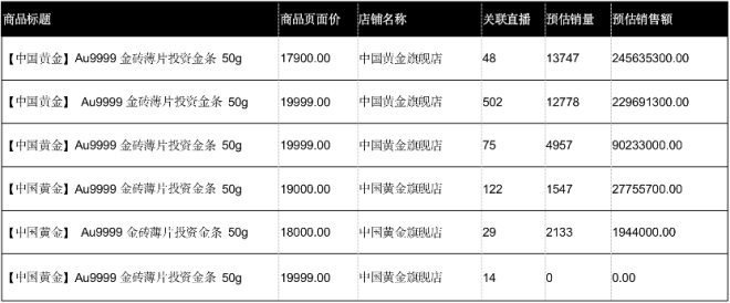 為了向兩個(gè)超級(jí)頭部發(fā)起進(jìn)攻,淘寶主播雪梨在今年以來(lái)大舉引進(jìn)醫(yī)美、珠寶等高客單價(jià)類(lèi)目。在6月的首個(gè)珠寶專(zhuān)場(chǎng)直播中,雪梨直播間的總銷(xiāo)售額達(dá)4.66億,全場(chǎng)最大的爆品是“中國(guó)珠寶牛氣沖天50克金條”,銷(xiāo)售額達(dá)4700萬(wàn)。