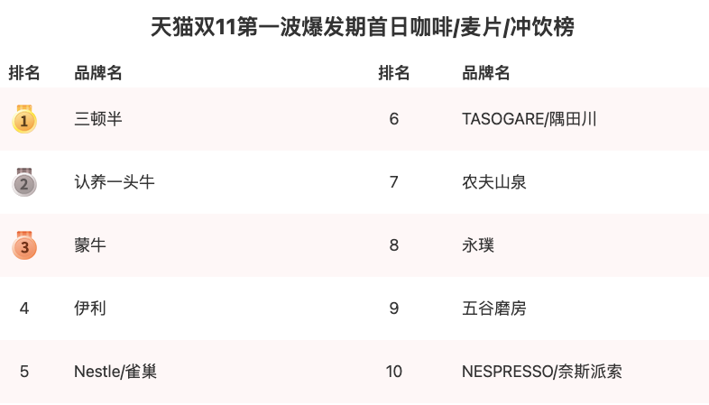 新品牌們還欠缺一個(gè)最佳賽道、最好的時(shí)機(jī),后來(lái)蜂擁而上的新品牌鮮有跑出來(lái)的,而第一波出來(lái)的新品牌目前還能保持一個(gè)好姿態(tài)。如在今天天貓雙十一的第一波榜單中,很多新消費(fèi)品牌已經(jīng)不復(fù)存在,但有幾個(gè)新品牌已登上了大類(lèi)目榜單,億邦動(dòng)力的金榜顯示,在咖啡/麥片/沖飲類(lèi)目中,三頓半、認(rèn)養(yǎng)一頭牛、隅田川、永璞都在TOP10榜單中,尤其三頓半、認(rèn)養(yǎng)一頭牛排在首位,超過(guò)了蒙牛、伊利和雀巢一眾大品牌。