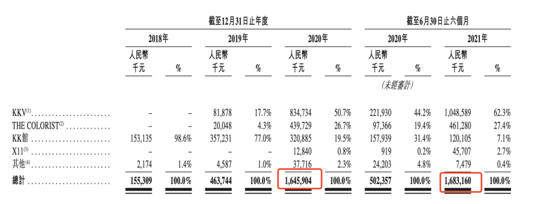 而營業(yè)收入更讓外界好奇。根據(jù)招股書,KK集團(tuán)在2018-2020年分別實(shí)現(xiàn)營收1.553億元、4.637億元和16.459億元;2021年上半年的營收為16.831億元;其2020年和2021上半年的毛利分別為4.997億和6.099億。