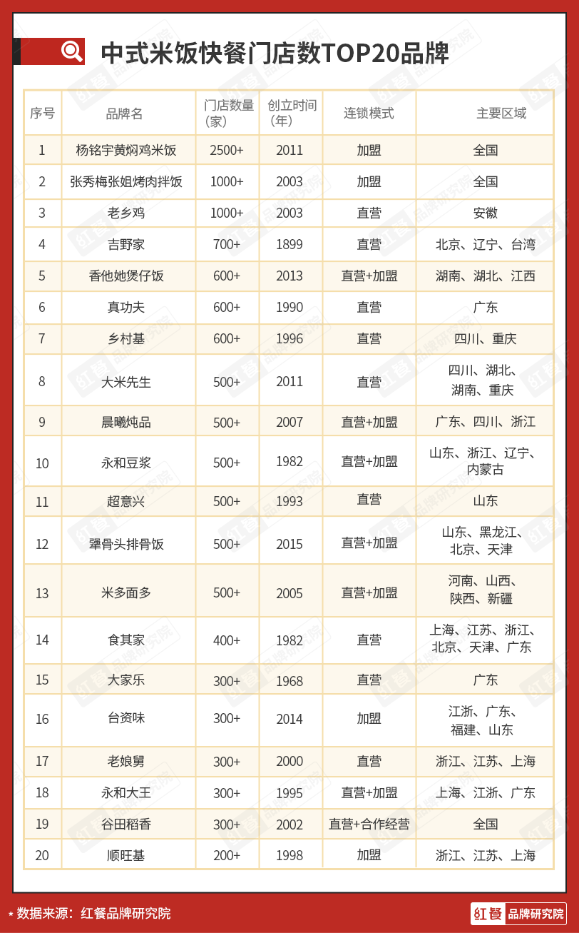 而過去一段時間著重深耕區(qū)域的米飯快餐品牌,反而在疫情之后有崛起之勢,比如西南霸主鄉(xiāng)村基,門店增至600多家,榜單排名從去年的第14提至第7,旗下大米先生今年開始挺進上海市場,其榜單排名也從去年的17名躍升為8,門店數(shù)增至500多家。