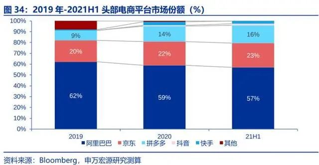 根據(jù)申萬宏源數(shù)據(jù)顯示,在2021第一季度,阿里,京東、拼多多合計市場份額的占比高達96%。在2021年下半年旺季中,電商平臺的用戶與商家爭奪仍將加劇。