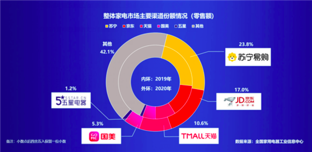 根據(jù)蘇寧2021第三季度財報,蘇寧易購月活達到了6376萬,而在2020年的家電渠道中,蘇寧易購以23.8%的占比高居第一,國美僅占5.3%,位列第四。