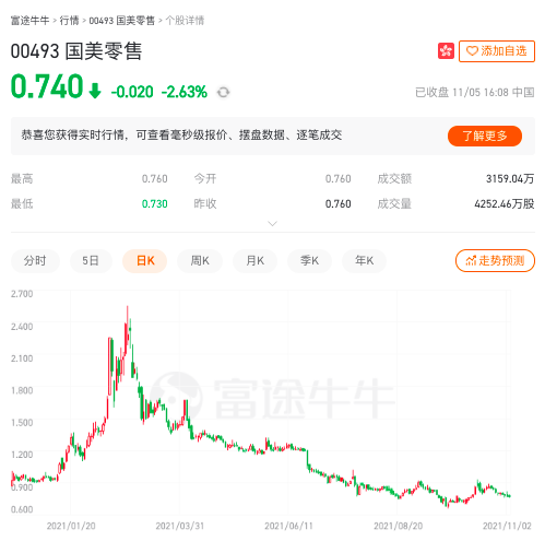 但是,2.55港元/股也成為了國美近十年來的最高點。短暫榮光后,隨著時間不斷推移,股價從最高點慢慢滑落,近9個月后股價最終回落到0.77港元/股,甚至比去年同期更低。