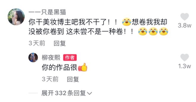 截至11月5日,柳夜熙在抖音上的第一條視頻獲贊超過270萬,評論超12萬,粉絲突破三百萬。視頻評論區(qū)也很有意思,抖音頭部網(wǎng)紅齊來留言,有位粉絲破千萬的博主更是表示:“你干美妝博主吧我不干了!”