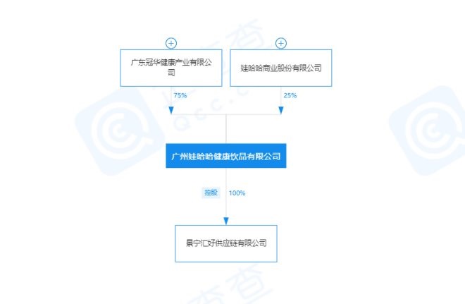 根據(jù)企查查數(shù)據(jù),廣州娃哈哈健康飲品有限公司成立于2019年10月,注冊資本200萬元人民幣,該公司有兩大股東,第一大股東為廣東冠華健康產(chǎn)業(yè)有限公司,持股比例75%;娃哈哈商業(yè)股份有限公司為第二大股東,持股比例25%,公司法定代表人為杭州娃哈哈集團(tuán)有限公司董事長宗慶后。