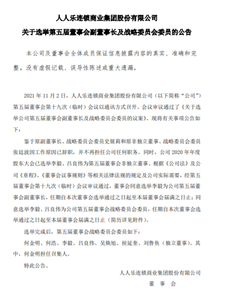 公告稱,人人樂原副董事長、戰(zhàn)略委員會(huì)委員史展莉和原非獨(dú)立董事、戰(zhàn)略委員會(huì)委員張廷波因工作原因已辭職,并不再擔(dān)任公司任何職務(wù)。同時(shí),人人樂2020年年度股東大會(huì)已選舉李毅、呂良偉為第五屆董事會(huì)非獨(dú)立董事。經(jīng)第五屆董事會(huì)第十九次(臨時(shí))會(huì)議審議通過,董事會(huì)同意選舉李毅為公司第五屆董事會(huì)副董事長,任期自本次董事會(huì)選舉通過之日起至本屆董事會(huì)屆滿之日止;同意選舉李毅、呂良偉為公司第五屆董事會(huì)戰(zhàn)略委員會(huì)委員,任期自本次董事會(huì)選舉通過之日起至本屆董事會(huì)屆滿之日止。