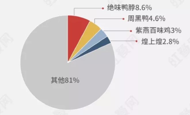 《中國餐飲品類與品牌發(fā)展報告2021》顯示,2020年鹵味賽道前五名品牌市場占有率僅占20%左右。其中,絕味鴨脖占8.6%、周黑鴨為4.6%、紫燕百味雞占3%、煌上煌占2.8%、久久丫占1.3%,剩下約80%的市場都分散在一些區(qū)域性品牌、單體私營小店以及規(guī)模較小的地方連鎖品牌手中。