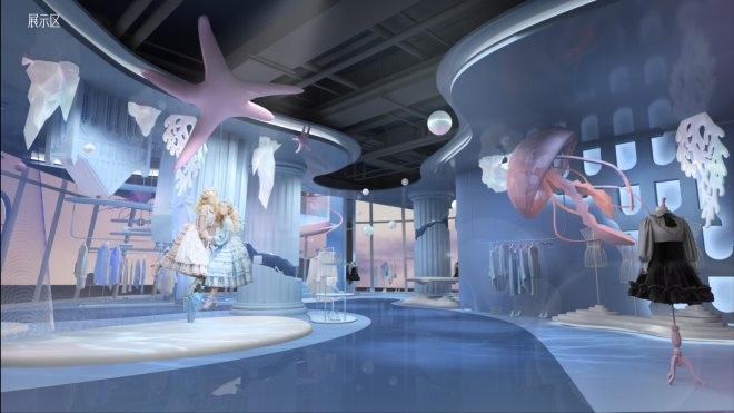 根據(jù)「詩(shī)與萬(wàn)花鏡」的設(shè)想,女孩們走進(jìn)來(lái)后會(huì)發(fā)現(xiàn)這是一個(gè)夢(mèng)幻的、脫離現(xiàn)實(shí)的地方,她能從中獲得收集美和裝扮美的快感,最終形成一個(gè)炫耀美的極大的快感;同時(shí),這也是一個(gè)從現(xiàn)實(shí)到夢(mèng)幻,再?gòu)膲?mèng)幻到現(xiàn)實(shí)的一個(gè)過(guò)程。