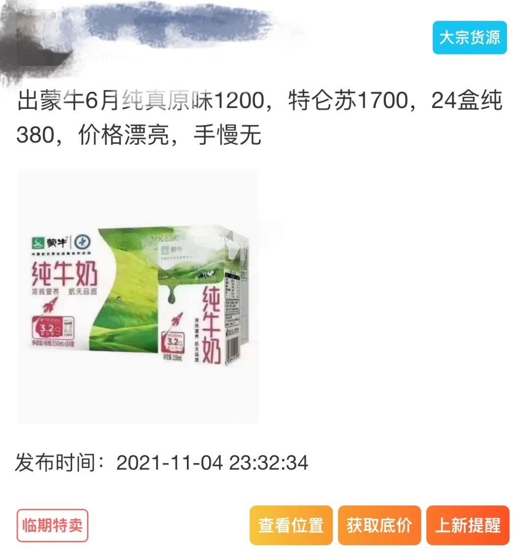 在三四線城市,這些產(chǎn)品可能是可口可樂,更有可能是臨期的蒙牛、伊利純牛奶。在相關(guān)的臨期倉庫小程序上搜索,位于河北、青島、山西等各省份的倉庫內(nèi),最多的也是金典、安慕希等大眾化產(chǎn)品。