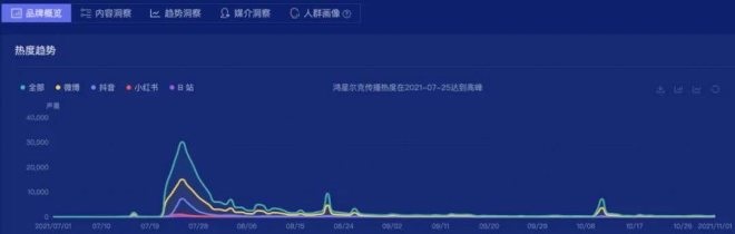 根據(jù)時趣洞察引擎對于鴻星爾克,從2021.7.1到2021.11.1,4個月的品牌熱度趨勢檢索,可以看出,這段時間鴻星爾克品牌主要出現(xiàn)過3個熱度峰值,分別是7月25日捐款河南5000萬被曝出,8月21日,官微發(fā)布馳援河南物資持續(xù)發(fā)放,以及10月10日,再捐款2000萬給山西賑災(zāi)。除此之外,品牌自身話題熱度都反應(yīng)非常平淡,也表明了,鴻星爾克意外爆紅之后,仍嚴(yán)重依賴于社會議題,用戶難以持續(xù)關(guān)注品牌本身。
