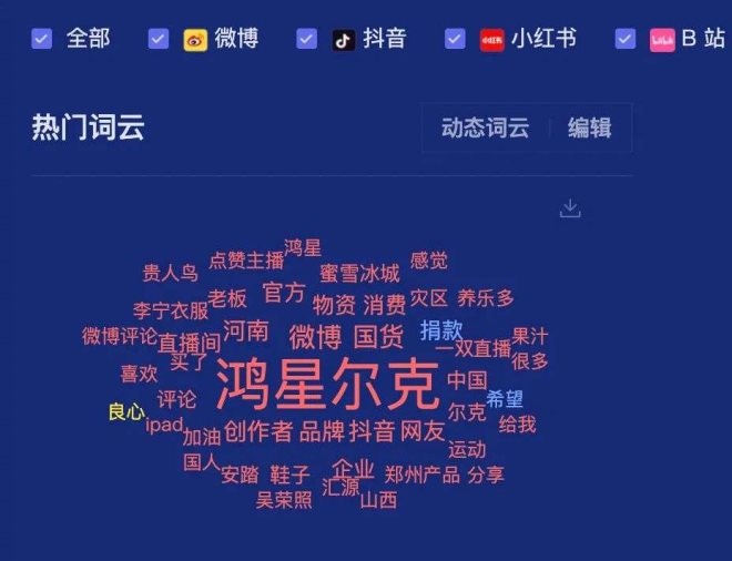 而對于鴻星爾克品牌多平臺的熱門詞云進行檢索分析,也可以看出#捐款#、#良心#、#國貨#等網(wǎng)友帶有社會情感傾向的詞語;而缺少品牌、產(chǎn)品、設(shè)計、價值觀相關(guān)的信息,也從側(cè)面說明了鴻星爾克自身的品牌力不足。