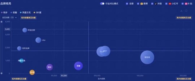 4、對比其他運動服飾品牌,鴻星爾克仍處于低內(nèi)容量低互動量象限