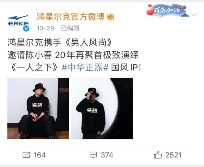 2001年鴻星爾克曾經(jīng)找過陳小春代言,并打出“to be NO.1”的廣告口號,一時間火遍大江南北。前段時間,10月29日,鴻星爾克發(fā)微博宣布,聯(lián)合陳小春拍攝國風(fēng)大片《一人之下》。時隔二十年,鴻星爾克第二次簽下陳小春。這本該是一場不錯的聯(lián)動,無論是情懷,還是熱度,但這條微博卻反響平平,并未引起大量關(guān)注。
