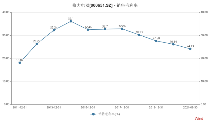 基于“技術(shù)+品牌+規(guī)模”打造的“護(hù)城河”,格力電器品牌溢價(jià)能力突出。體現(xiàn)在盈利能力能力上,公司毛利率常年維持在30%以上,甩開競(jìng)爭(zhēng)對(duì)手7、8個(gè)百分點(diǎn)。