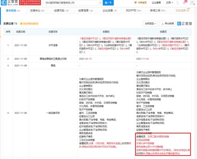聯(lián)商快訊:11月10日消息,據(jù)企查查顯示,喜茶關(guān)聯(lián)公司深圳美西西餐飲管理有限公司近日發(fā)生工商變更,經(jīng)營(yíng)范圍新增日用口罩(非醫(yī)用)銷售;日用化學(xué)產(chǎn)品銷售;單用途商業(yè)預(yù)付卡代理銷售等。
