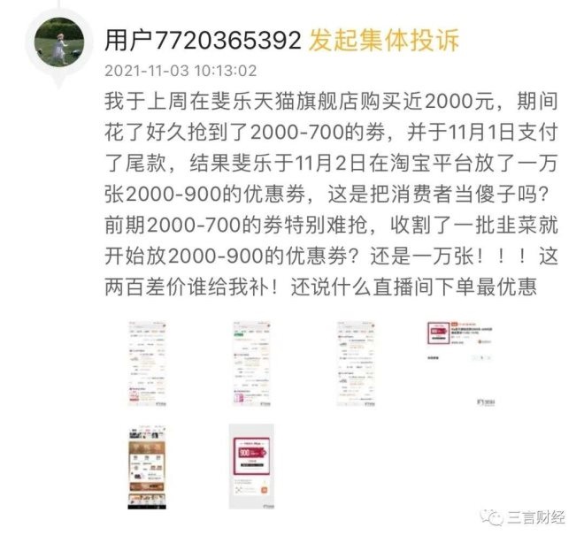 但是沒(méi)想到11月1日支付尾款后,斐樂(lè)于11月2日發(fā)放了一張滿2000減900的優(yōu)惠券;而且一次性發(fā)放一萬(wàn)張,比預(yù)售期間的優(yōu)惠券更好搶到。