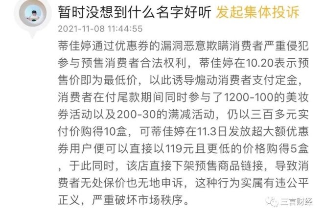 有多名消費(fèi)者投訴稱,蒂佳婷在10月20日開(kāi)啟的“雙十一”預(yù)售活動(dòng)中承諾預(yù)售價(jià)即為最低價(jià)格,以此刺激消費(fèi)著支付定金。同時(shí),消費(fèi)者在支付尾款期間同時(shí)參與了店鋪中1200減100的美妝券,使得大家能夠以300余元購(gòu)得10盒產(chǎn)品。