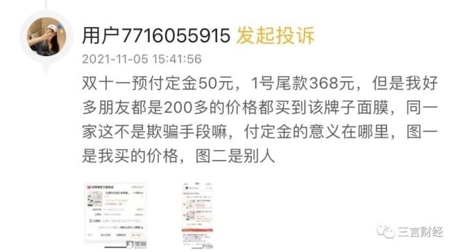 還有消費(fèi)者稱,自己花總價(jià)格四百余元購(gòu)買(mǎi)的歐萊雅面膜,結(jié)果尾款付完后發(fā)現(xiàn)自己很多朋友只用花200元就可以現(xiàn)買(mǎi)到,認(rèn)為這是屬于消費(fèi)欺詐。