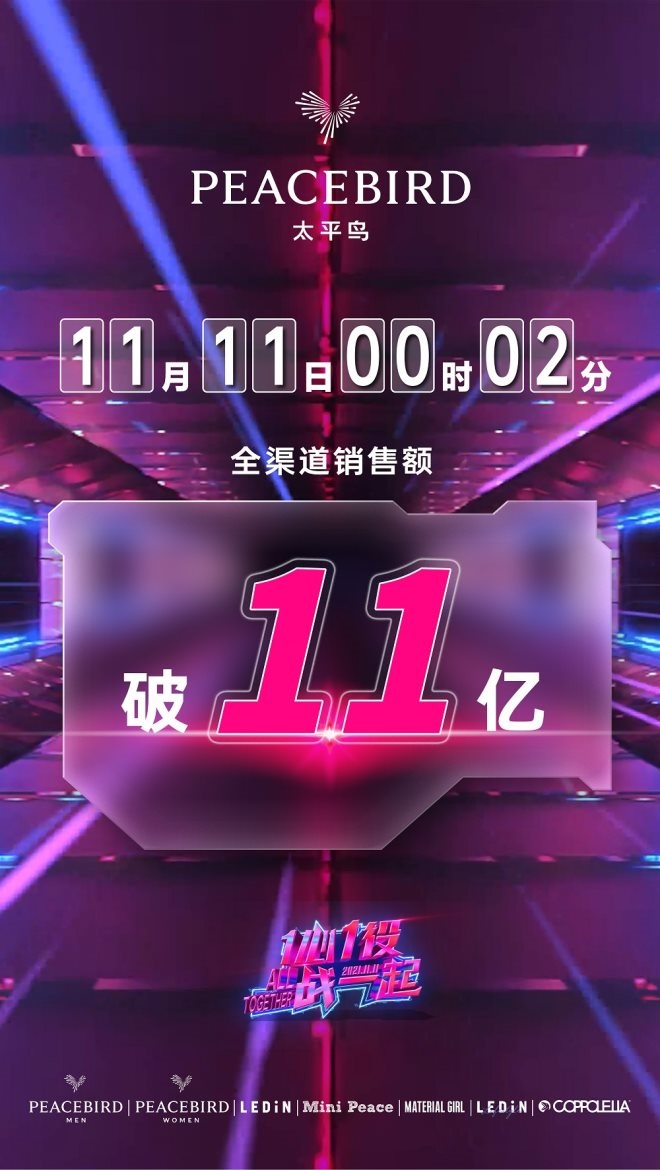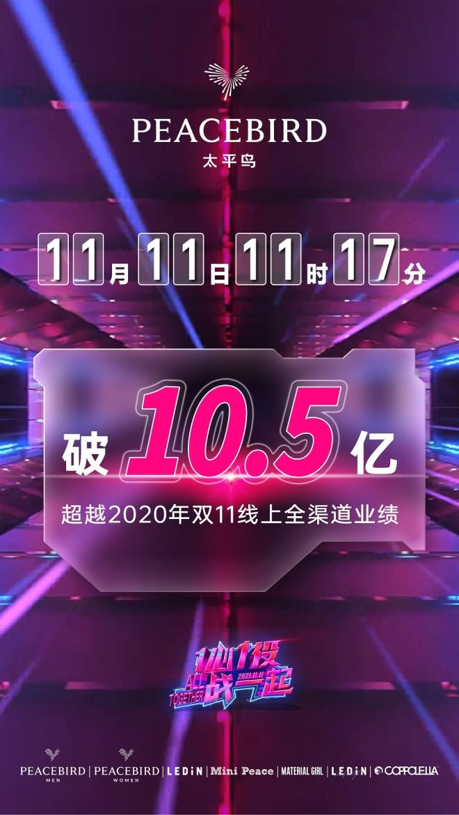根據(jù)官方數(shù)據(jù),截至11日上午11點17分,太平鳥線上渠道全品牌突破2020年的10.5億紀錄。