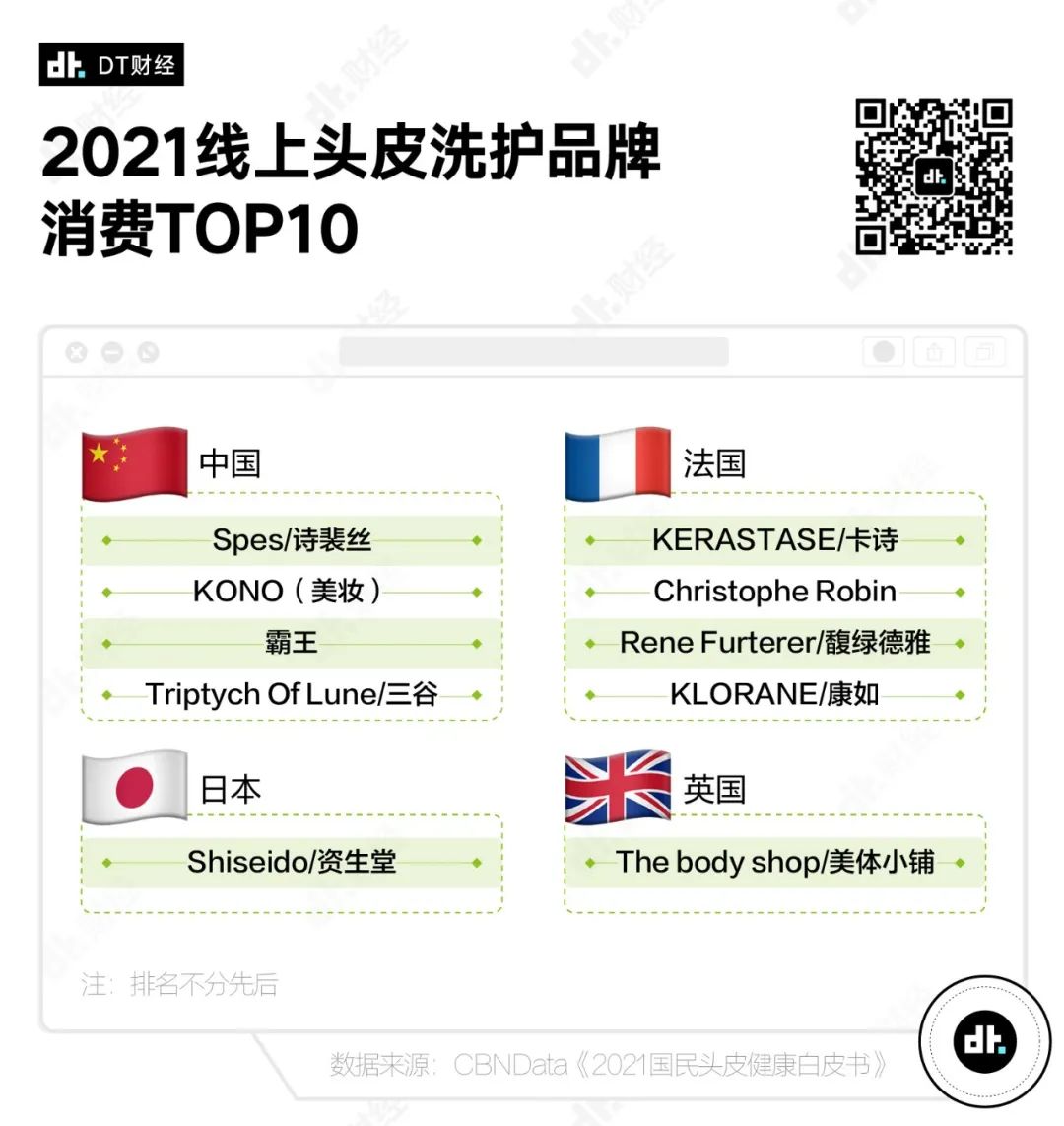 據(jù)《2021國(guó)民頭皮健康白皮書》,在2021線上頭皮洗護(hù)品牌消費(fèi)榜單前10名中,有4個(gè)來(lái)自中國(guó)。除了2005年憑借成龍一句“duang”而讓人印象深刻的霸王,其余3款分別來(lái)自新品牌Spes詩(shī)裴絲、KONO、和三谷。