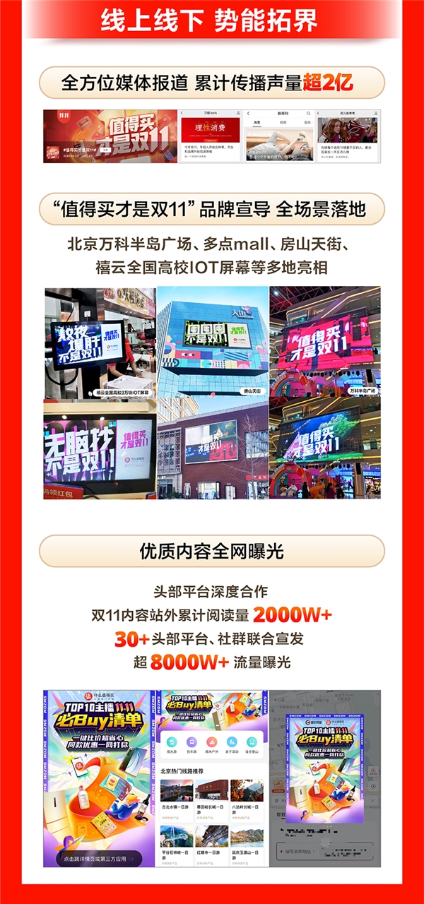 值得買科技的營銷布局不僅局限于線上,為充分打透“值得買才是雙11”的消費心智,值得買科技在北京萬科半島廣場、多點mall、房山天街、全國高校IOT屏幕等多個線下場所亮相,并結合全域媒體投放,最終實現30+頭部平臺、社群聯合宣發(fā),累計傳播聲量超過2.3億。
