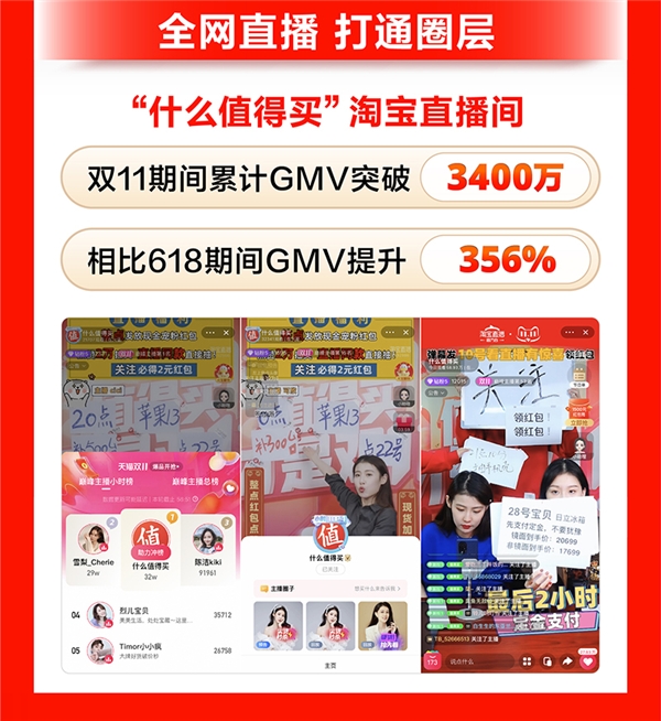 什么值得買淘寶直播間作為平臺站外核心營銷陣地,雙11期間累計GMV突破3400萬元,相比618期間提升356%。