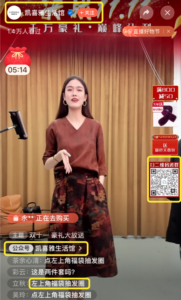 和一般直播間都會(huì)放一兩款“秒殺價(jià)”的產(chǎn)品或者直播間賣爆的“鎮(zhèn)店之寶”不同,秋秋還發(fā)現(xiàn),視頻號(hào)的直播間,產(chǎn)品的價(jià)格都不低,商家通常會(huì)強(qiáng)調(diào)“款式”。尤其是視頻號(hào)直播上很多與真絲、羊絨有關(guān)的商品,主播一般會(huì)告訴觀眾,這一款只有自己家能做,或者“全年只有雙11有這個(gè)折扣”。