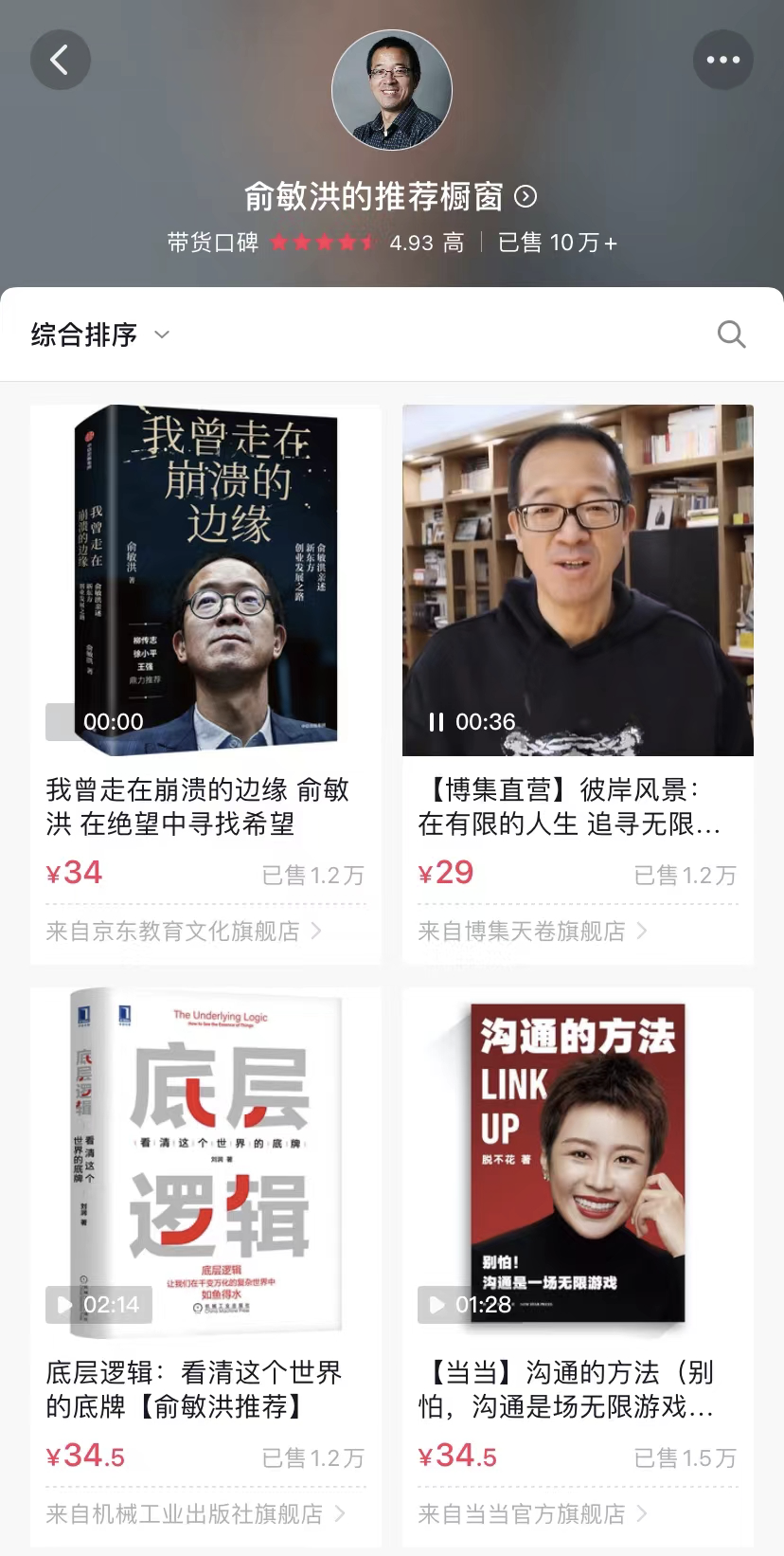 俞敏洪在抖音上“推薦櫥窗”排名前四的產(chǎn)品均是書籍