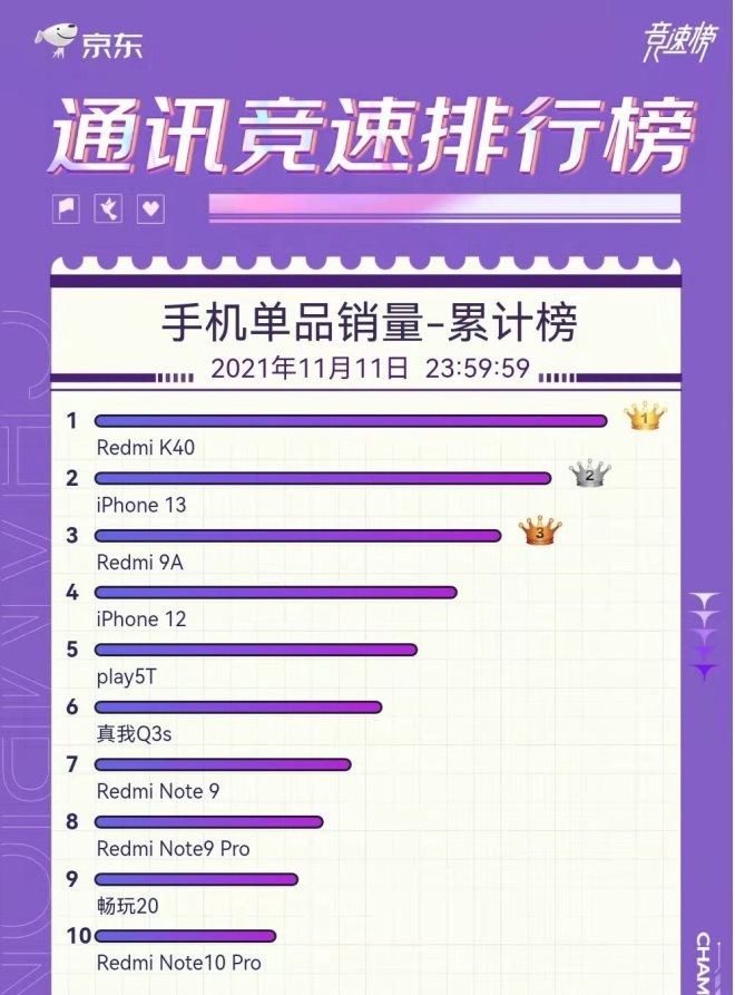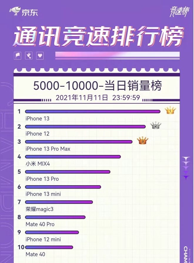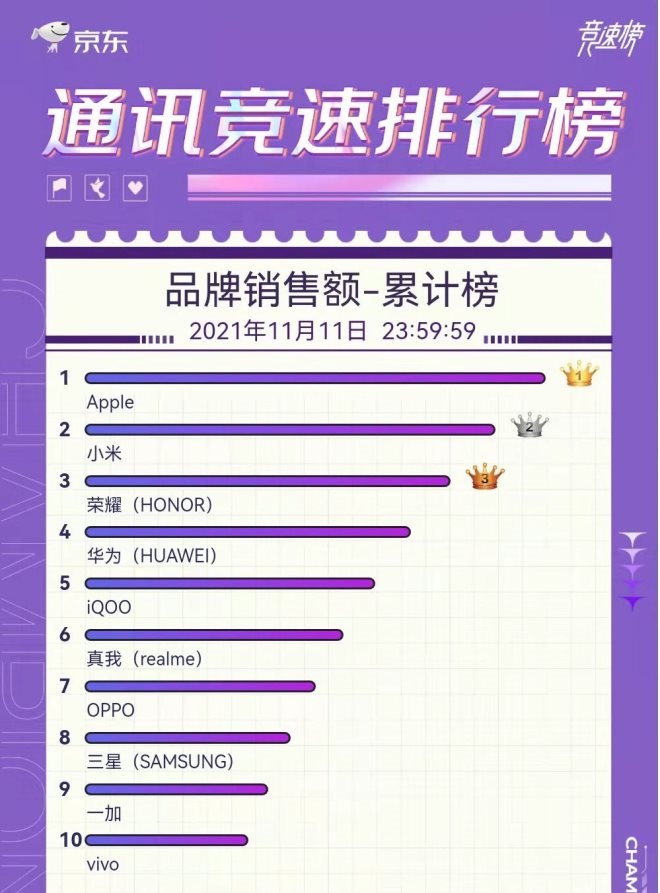 其中,京東手機競速榜顯示,在截至11月11日23:59的整個“雙11”促銷期間,京東平臺手機品牌銷量累計排名前五的品牌分別為小米、蘋果、榮耀、realme、OPPO;品牌銷售額累計排名前五的品牌分別為蘋果、小米、榮耀、華為、iQOO。其中,蘋果在京東平臺的銷售額突破百億元。