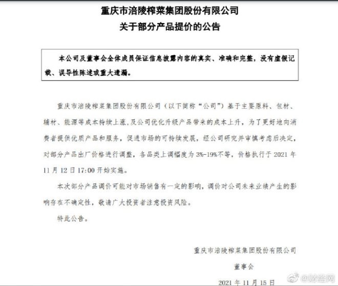 11月14日,涪陵榨菜發(fā)布公告稱,對(duì)部分產(chǎn)品出廠價(jià)格進(jìn)行調(diào)整,各品類上調(diào)幅度為3%-19%不等,價(jià)格執(zhí)行于11月12日17:00開始實(shí)施。
