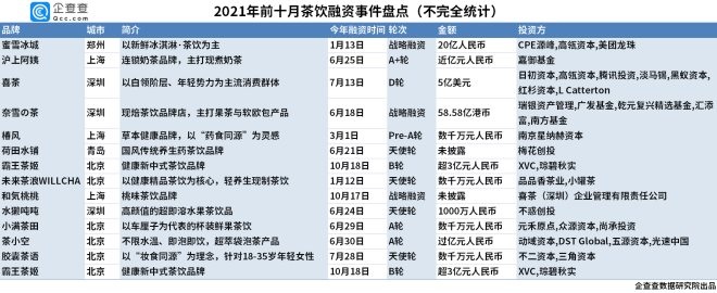 企查查數(shù)據(jù)顯示,前十月蜜雪冰城、奈雪的茶、喜茶、滬上阿姨等較為知名的奶茶品牌獲得融資,其中奈雪的茶獲得58.58億港元的戰(zhàn)略投資,并于6月30日赴港上市;喜茶完成5億美元的D輪融資;蜜雪冰城獲得20億元的戰(zhàn)略投資,投資者有高瓴資本、美團龍珠等;滬上阿姨獲得了一筆近億元的A+輪融資,資本市場對知名品牌仍然信心十足。
