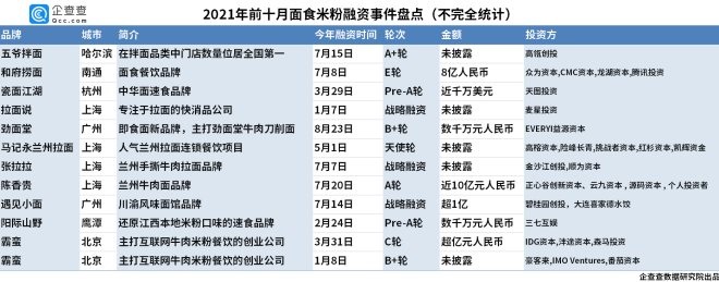3、地域特色品牌備受追捧:2021年面食米粉融資事件超12起