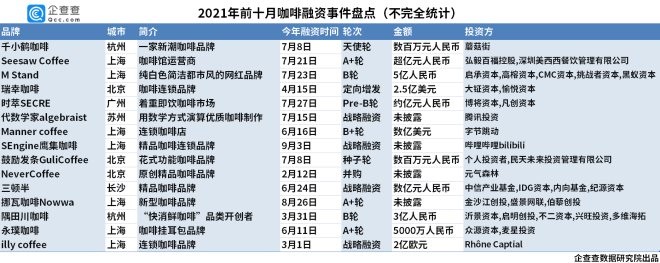 2021年,資本市場加速了對咖啡市場的投資步伐,賽道一片火熱。企查查數(shù)據(jù)顯示,前十月國內咖啡行業(yè)相關融資披露總額接近60億元,部分熱門品牌甚至在上半年就拿到2輪或3輪融資,如SEngine鷹集咖啡、Manner、M Stand等。此外,三頓半、永璞、代數(shù)學家algebraist、Nowwa挪瓦咖啡等新品牌都在資本的進一步助推下迅速崛起。一些老品牌在沖刺連鎖百店,挺進購物中心發(fā)展,突破白領圈層走向大眾化。