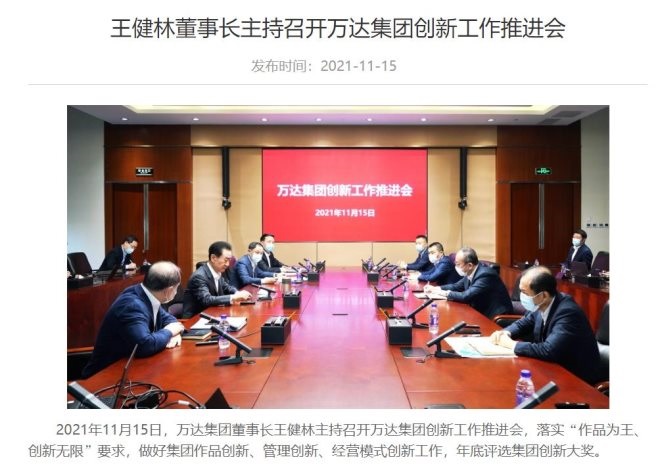 11月15日,萬達集團官網(wǎng)發(fā)表了《王健林董事長主持召開萬達集團創(chuàng)新工作推進會》的相關(guān)報道。