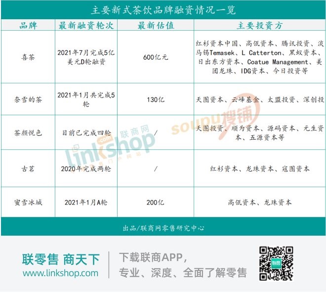 從資本的流向看,各細(xì)分賽道頭部品牌是資本爭搶的香餑餑。據(jù)聯(lián)商網(wǎng)零售研究中心統(tǒng)計,喜茶、奈雪的茶、茶顏悅色、蜜雪冰城等茶飲品牌近年來都獲取了至少上億元融資。