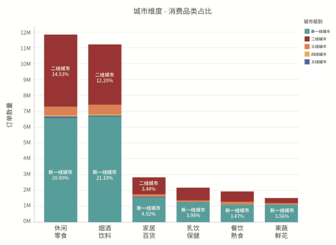 無論是新一線、二線城市,還是三四五線城市,消費者購物量最多的兩大品類均為休閑零食和酒水飲料。