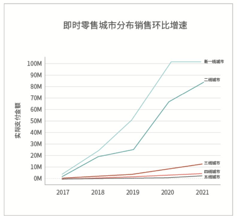 我們將此次分析的方向瞄準了非一線城市以外的城市,結(jié)果顯示,新一線、二線城市的即時零售市場均在2020年迎來了大爆發(fā),即時是基數(shù)相對較小的三線城市,自2019年之間,其市場增長也達到了3倍。