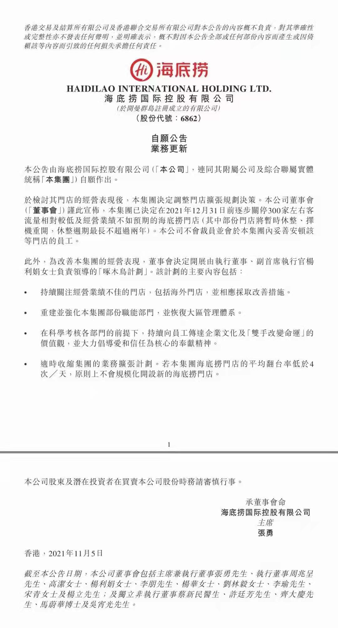 11月5日,作為上市公司的海底撈,發(fā)布了一份公告,宣稱要在2022年元旦前,在全國關(guān)停300家左右門店。這個公告一出,瞬間成為行業(yè)熱點(diǎn)新聞,在餐飲行業(yè)引起軒然大波,隨后,各路機(jī)構(gòu)和行業(yè)人士,對這件事表達(dá)觀點(diǎn)。