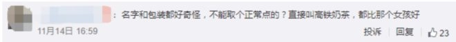 例如:有網(wǎng)友表示,為了幫高鐵乘務(wù)員小姐姐完成指標(biāo),點了一杯奶茶。“26塊,說實話不便宜,味道還不如香飄飄一塊一包的茶包,也不如阿薩姆”;“我下了火車去買兩杯蜜雪冰城或者買一杯喜茶也比這個好喝吧。”此外,還有網(wǎng)友認(rèn)為高鐵奶茶包裝不好看,“還不如整點風(fēng)景名勝或者動物圖像上去”;有消費者甚至表示“包裝和名字都有點鄉(xiāng)鎮(zhèn)奶茶店風(fēng)格!