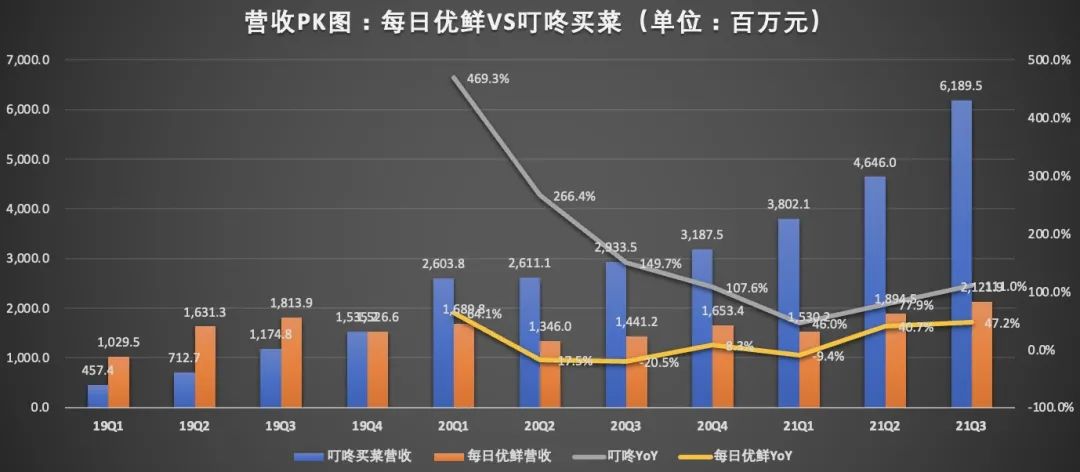 對(duì)比二者數(shù)據(jù)來看,叮咚買菜的營收規(guī)模幾乎是每日優(yōu)鮮的3倍。