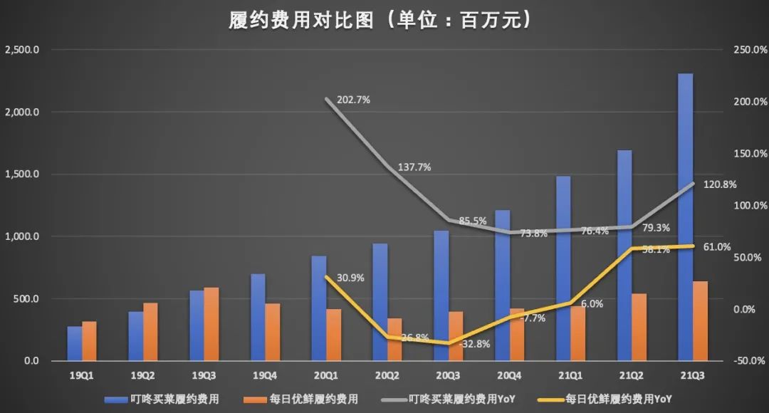 更多數(shù)據(jù)顯示,每日優(yōu)鮮三季度的履約費(fèi)用為6.38億元,同比增長61%,環(huán)比增長17.9%。相較之下,叮咚買菜三季度的履約費(fèi)用為23.09億元,同比增長120.8%,環(huán)比增長36.3%。叮咚買菜的履約費(fèi)用是3.6倍之多。