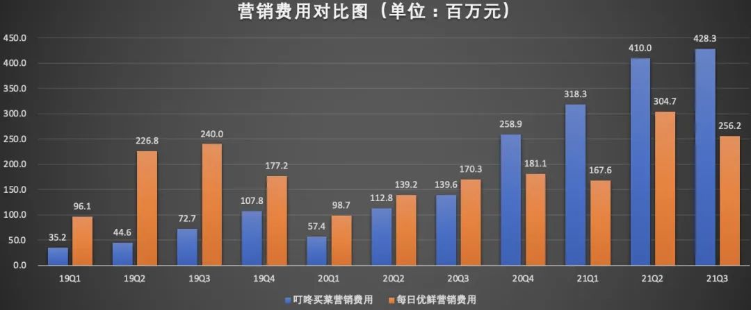 財(cái)報(bào)顯示,每日優(yōu)鮮三季度營銷費(fèi)用為2.56億元,同比增長50.5%,環(huán)比下降15.9%;叮咚買菜三季度營銷費(fèi)用為4.28億元,同比增長206.8%,環(huán)比增長4.5%。