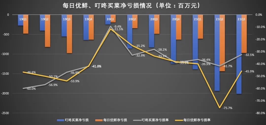 最后,叮咚買菜凈虧損是每日優(yōu)鮮的兩倍之多。