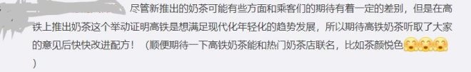 有網(wǎng)友直言,雖然目前推出的奶茶與消費者期待有一定差別,但這個措施證明了高鐵滿足年輕化的趨勢,希望能汲取大家的意見積極改進,甚至可以與茶顏悅色等知名茶飲品牌聯(lián)名。