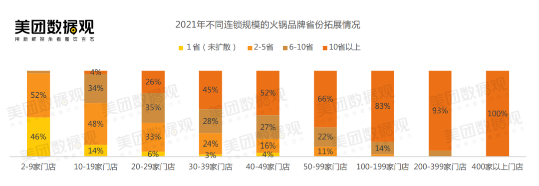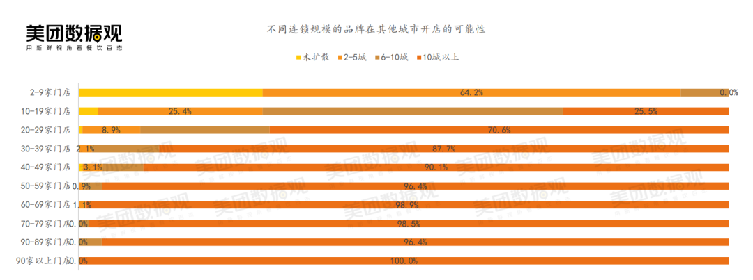 結合數(shù)據(jù),有意思的觀點是,當門店數(shù)量20家以下時,擴張會比較謹慎,而超過30家以上時,88%的品牌就會拓店至10個城市。 以省份為切分單元,當門店數(shù)超過40家時,半數(shù)以上的品牌會開到10個省份以上。